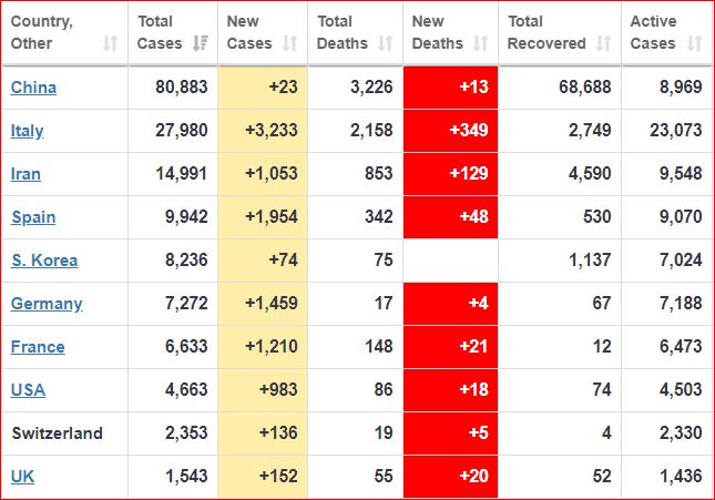 Coronavirus COVID-19 mempengaruhi 162 negara dan teritori di seluruh dunia dan 1 alat angkut internasional (kapal pesiar Diamond Princess berlabuh di Yokohama, Jepang). Hari diatur ulang setelah tengah malam GMT + 0. Kolom "Baru" untuk Cina menampilkan perubahan hari sebelumnya (seperti yang dilaporkan Cina setelah hari berakhir). Untuk semua negara lain, kolom "Baru" menampilkan perubahan untuk hari ini saat masih dalam proses.