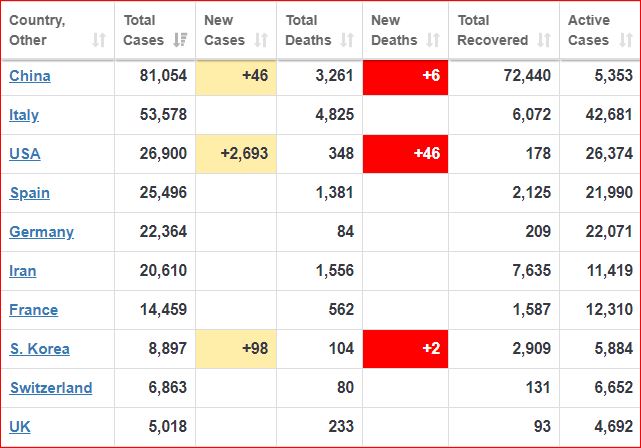 Sementara 10 besar kasus untuk 182 negara di dunia posisi ke-3 Spanyol, digantikan Amerika Serikat, Lihat Tabel: