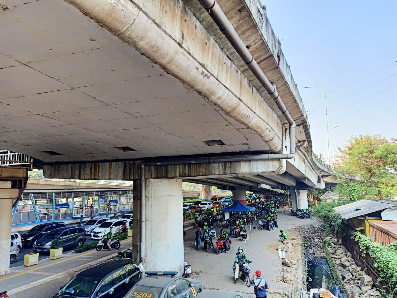 Antrian pemeriksaan ojek online di perempatan Jl. Pemuda Pramuka bypass, Jakarta, Senin (29/6/20)