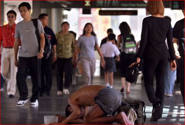 Seorang pria memohon perubahan di sepanjang jalan layang saat pejalan kaki yang acuh tak acuh berlalu, 10 Oktober 2000 di Hong Kong, di mana kesenjangan antara kaya dan miskin melebar.