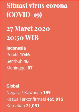 Hingga Jumat sore (27/3) total kasus corona Indonesia mencapai 1046 orang positif.