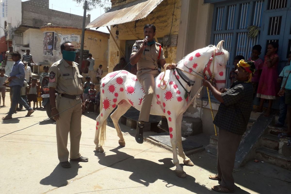 Dalam foto yang diambil pada 30 Maret 2020 ini, seorang petugas polisi (C) mengendarai seekor kuda yang ditutupi dengan lukisan bertema coronavirus ketika ia berbicara kepada publik selama penguncian nasional yang diberlakukan pemerintah terhadap coronavirus COVID-19, di desa Peapally Mandal, Distrik Kurnool di negara bagian Andhra Pradesh. FOTO: AFP