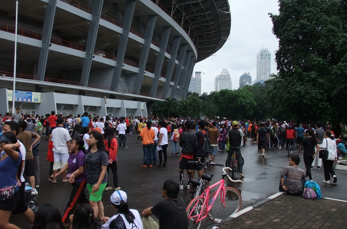 Pada pagi ini banyak warga DKI Jakarta berbondong-bondong berolahraga di sekeliling GBK. Antrean warga terlihat di pintu masuk. Petugas membuka akses masuk melalui pintu 10.