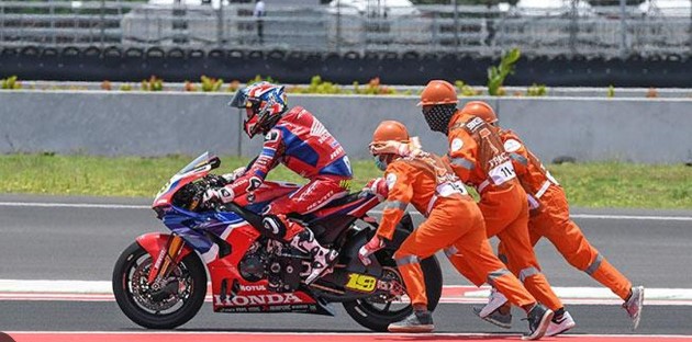 Pit marshal bertugas saat terjadi insiden di tengah balapan.