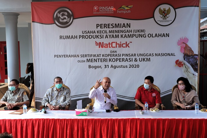 "Peternak ayam yang umumnya UMKM merupakan salah satu motor penggerak ekonomi rakyat. Pemerintah berkomitmen melindungi dan membantu mereka untuk bisa tumbuh melalui koperasi, karena saat ini peternak perorangan atau skala kecil akan susah bersaing di pasar," ujar MenkopUKM Teten Masduki usai meresmikan UKM Rumah Produksi Ayam Kampung Olahan dengan merek NatChick dan Penyerahan Sertifikat Koperasi Pinsar Unggas Nasional yang diinisiasi oleh PT Sumber Unggas Indonesia (SUI), di Jl.Sukabakti, Cogrek, Kec.Parung Bogor, Senin (31/8).
