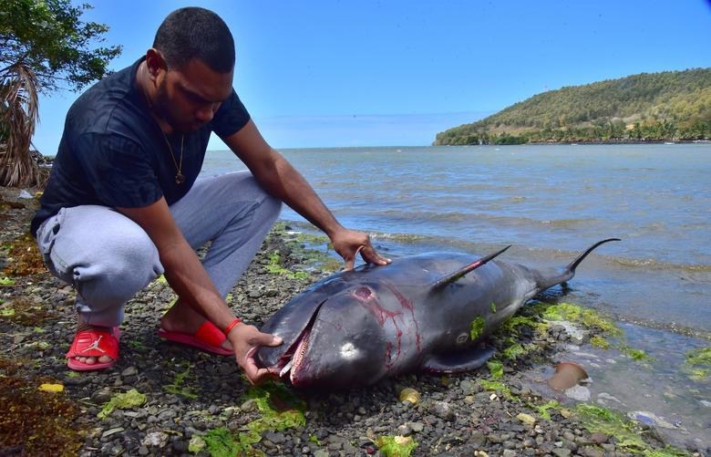 Para nelayan bertempur pada Minggu untuk menyelamatkan puluhan lumba-lumba yang terluka terdampar di pantai Mauritius di mana dalam beberapa hari terakhir setidaknya 40 hewan ditemukan mati di sebuah laguna dekat lokasi tumpahan minyak dari kapal induk Jepang yang menghantam terumbu karang.