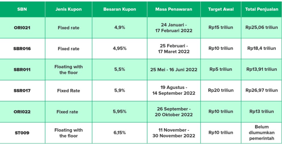 Pemerintah telah meluncurkan enam seri Surat Berharga Negara (SBN) sepanjang 2022. Mulai dari ORI021, SR016, SBR011, SR017, ORI022, dan ST009.