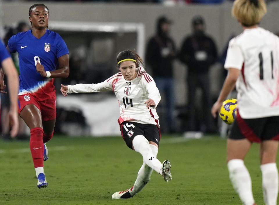 6B:Gelandang Jepang Yui Hasegawa (14) mengoper bola selama pertandingan sepak bola wanita internasional SheBelieves Cup melawan Amerika Serikat di Stadion Snapdragon di San Diego, California, pada 26 Februari 2025 [ist]