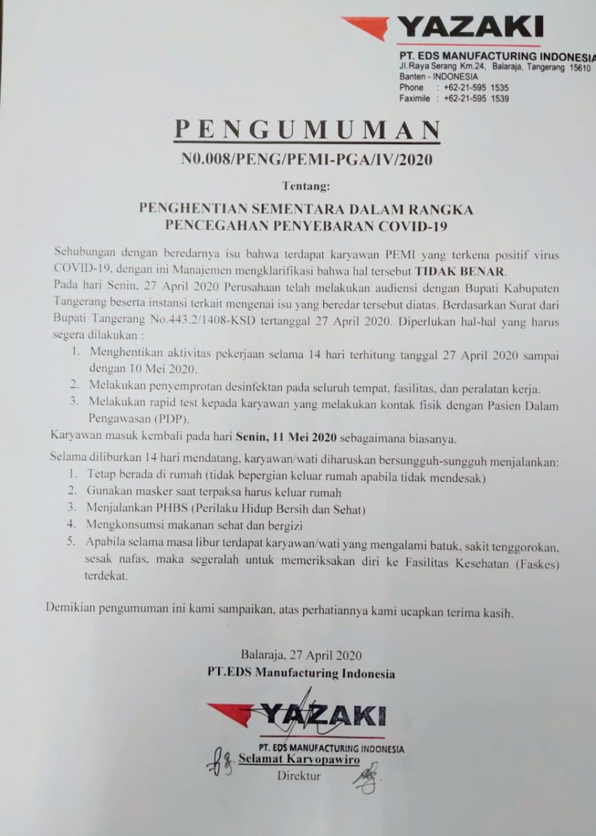 Sebelumnya beredar berita yang mengatakan bahwa ada beberapa karyawan dari sebuah pabrik PT. Eds Manufacturing Indonesia (PT PEMI) di Balaraja positif corona. Dalam sebuah surat edaran pihak perusahaan membantah bahwa terdapat karyawan mereka positif corona.